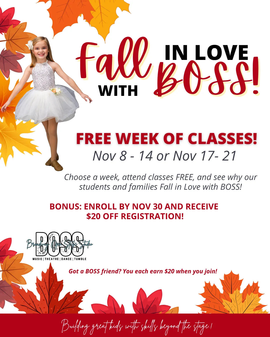CHOOSE A WEEK, ATTEND CLASSES FREE, AND SEE WHY STUDENTS AND FAMILIES FALL IN LOVE WITH BOSS!